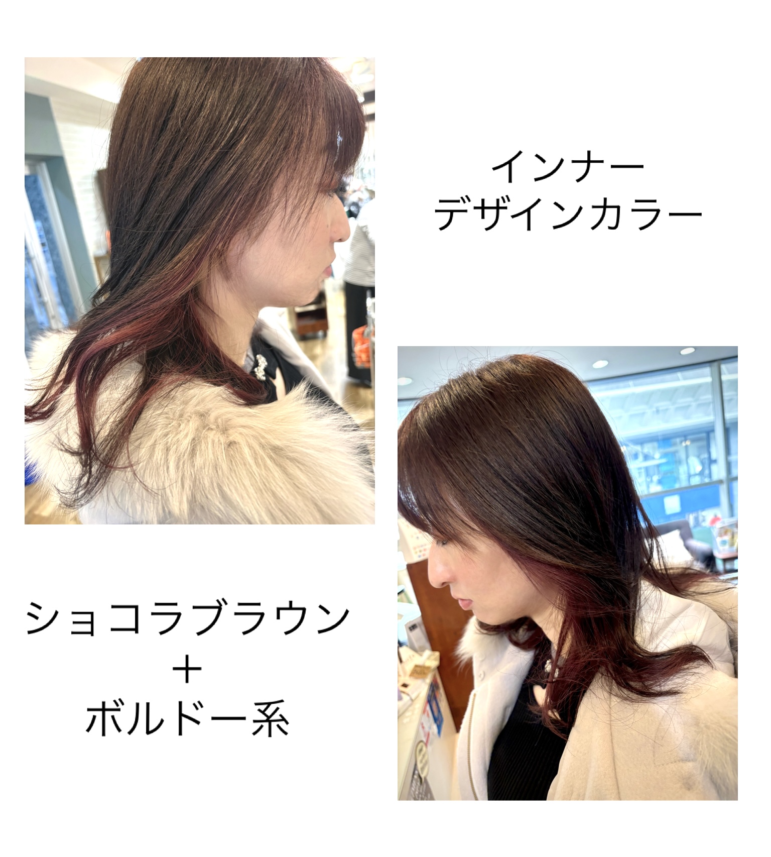 ショコラブラウン系にボルドー系のインナーで仕事で結ぶ時も隠れるくらいにしてます。